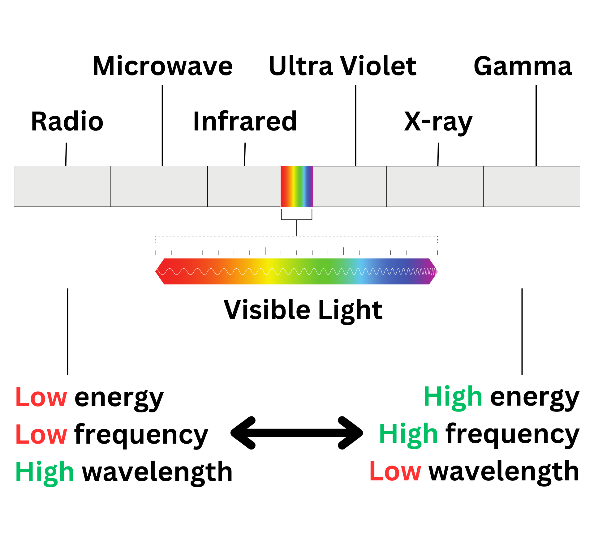 The above image shows all of the types of electromagnetic radiation. As you can see, most electromagnetic radiation is not visible to the human eye (pun intended).