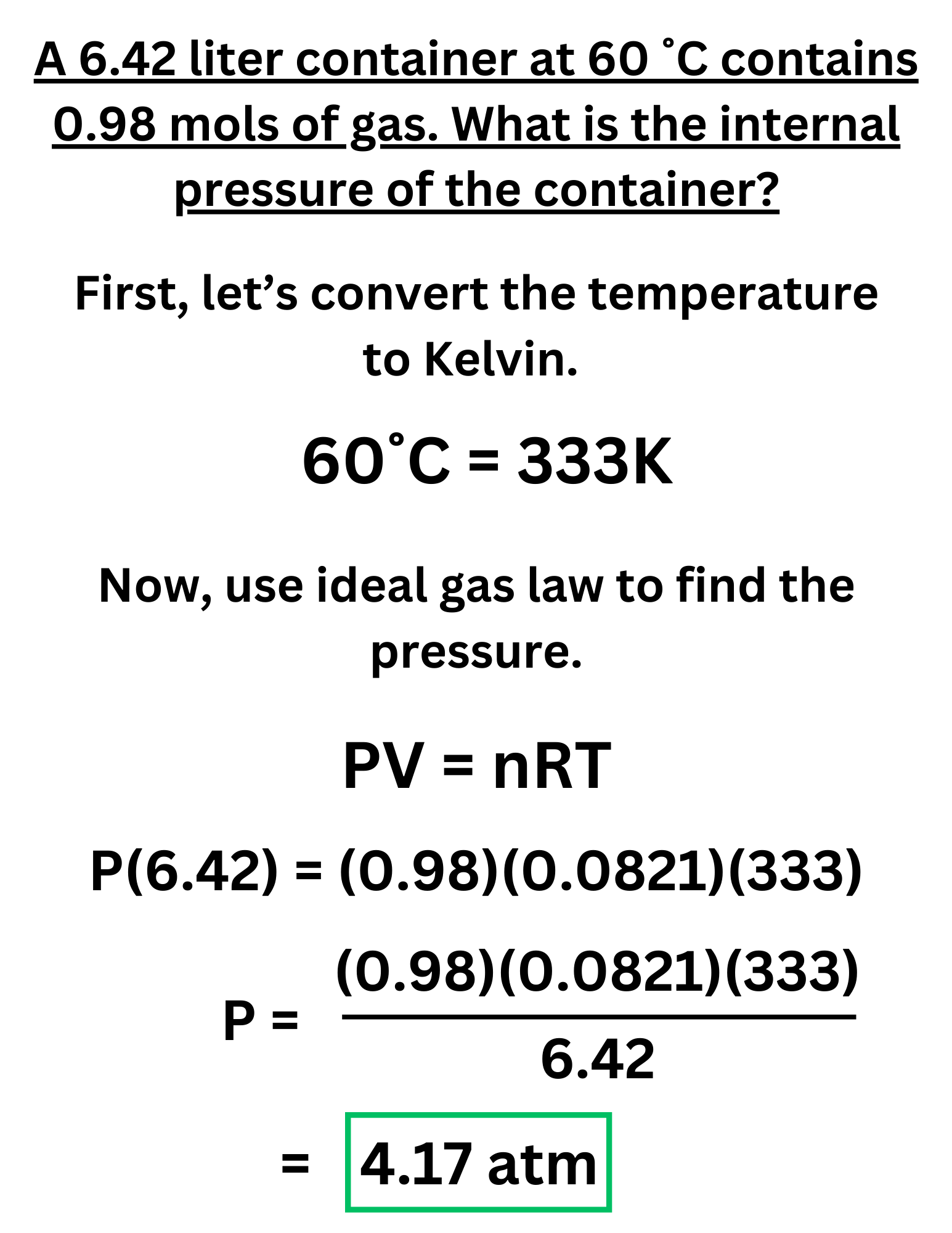 A 6.42 liter container at 60 ˚C contains 0.98 mols of gas. What is the internal pressure of the container?