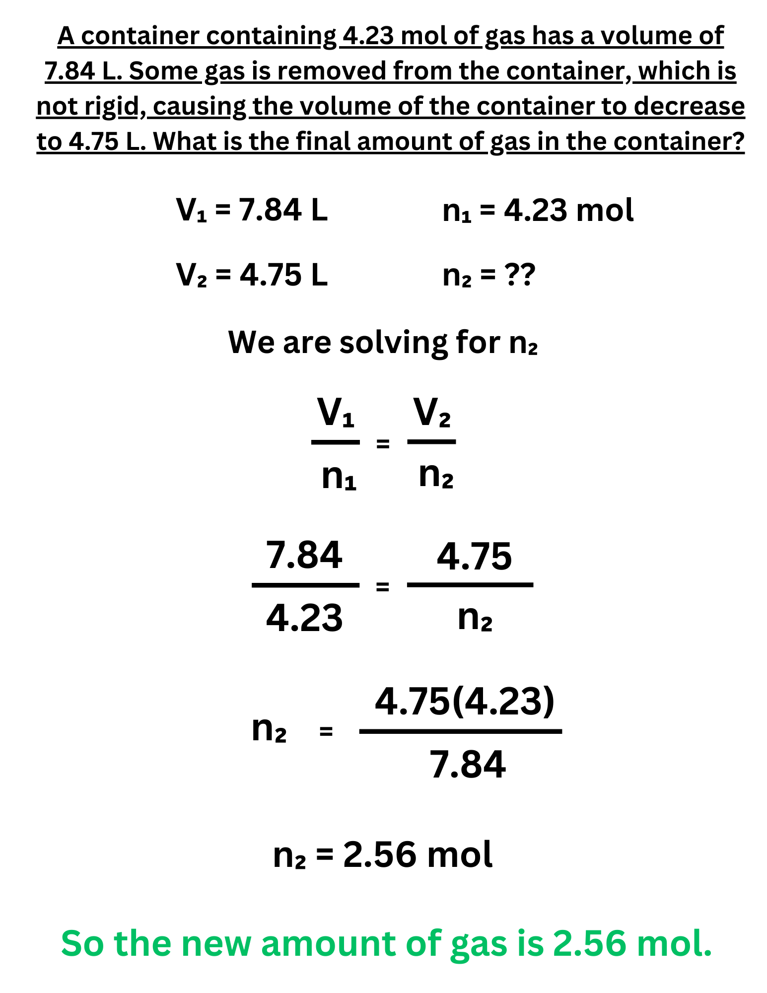 A container containing 4.23 mol of gas has a volume of 7.84 L. Some gas is removed from the container, which is not rigid, causing the volume of the container to decrease to 4.75 L. What is the final amount of gas in the container?