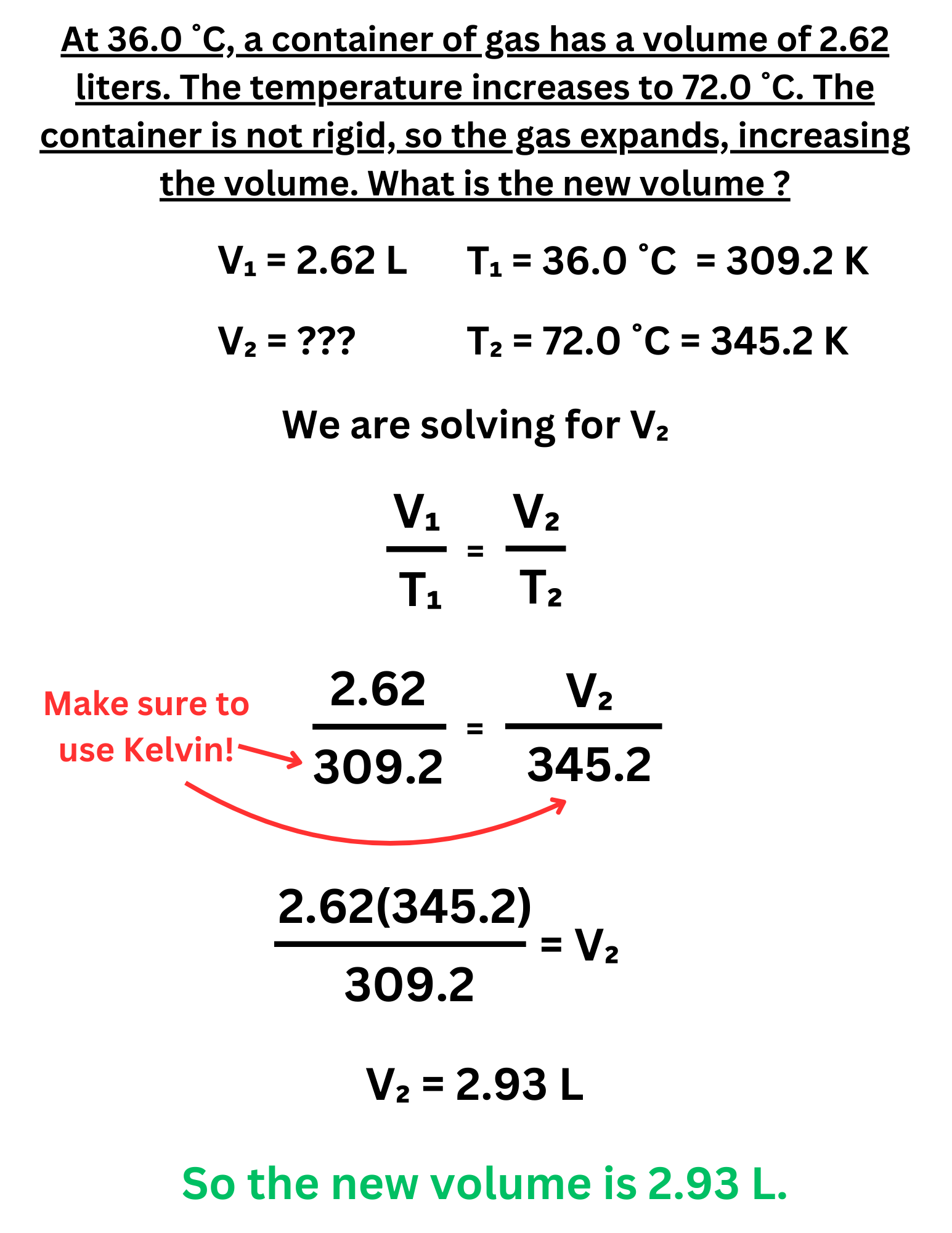 At 36.0 ˚C, a container of gas has a volume of 2.62 liters. The temperature increases to 72.0 ˚C. The container is not rigid, so the gas expands, increasing the volume. What is the new volume ?