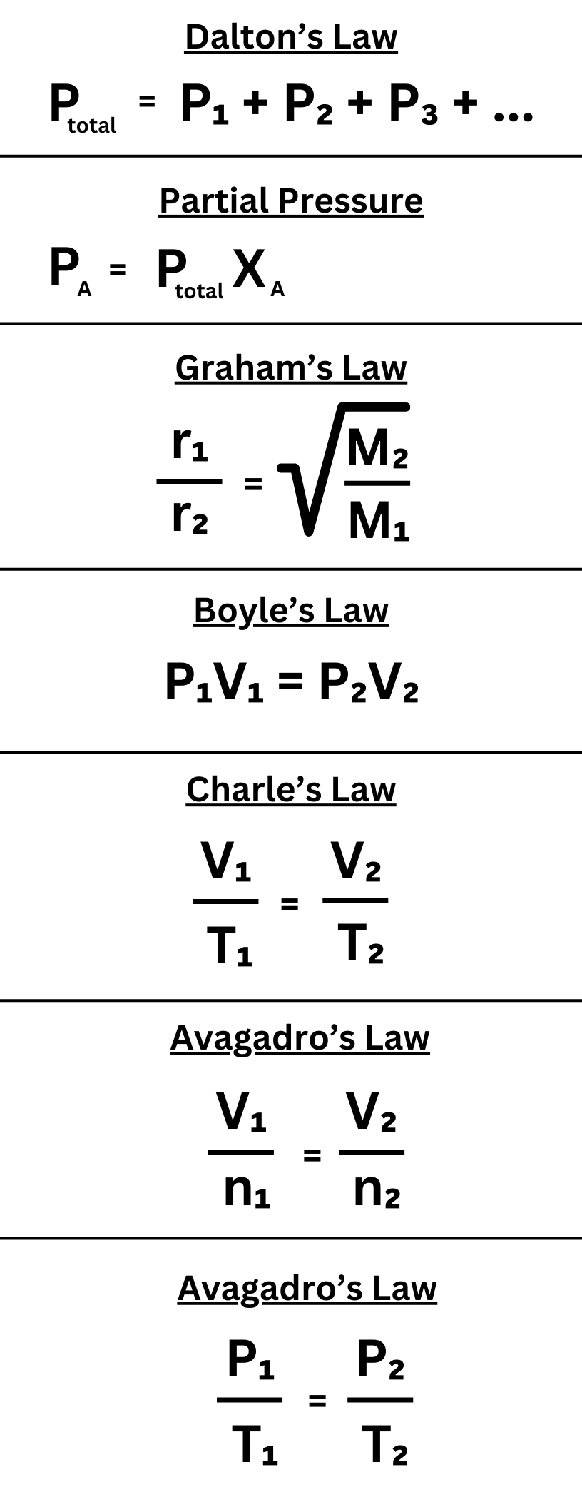 Here is a little “cheat sheet” that summarizes all of the equations in the “Minor Gas Laws” topic.