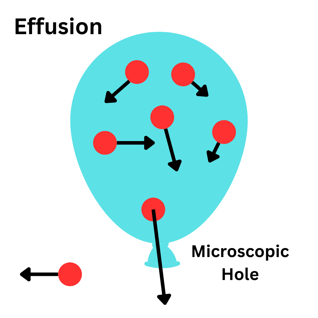 Ex. A balloon filled with air will slowly start to deflate because of effusion. There is a microscopic hole at the bottom of the balloon, allowing gas particles to slowly escape overtime.