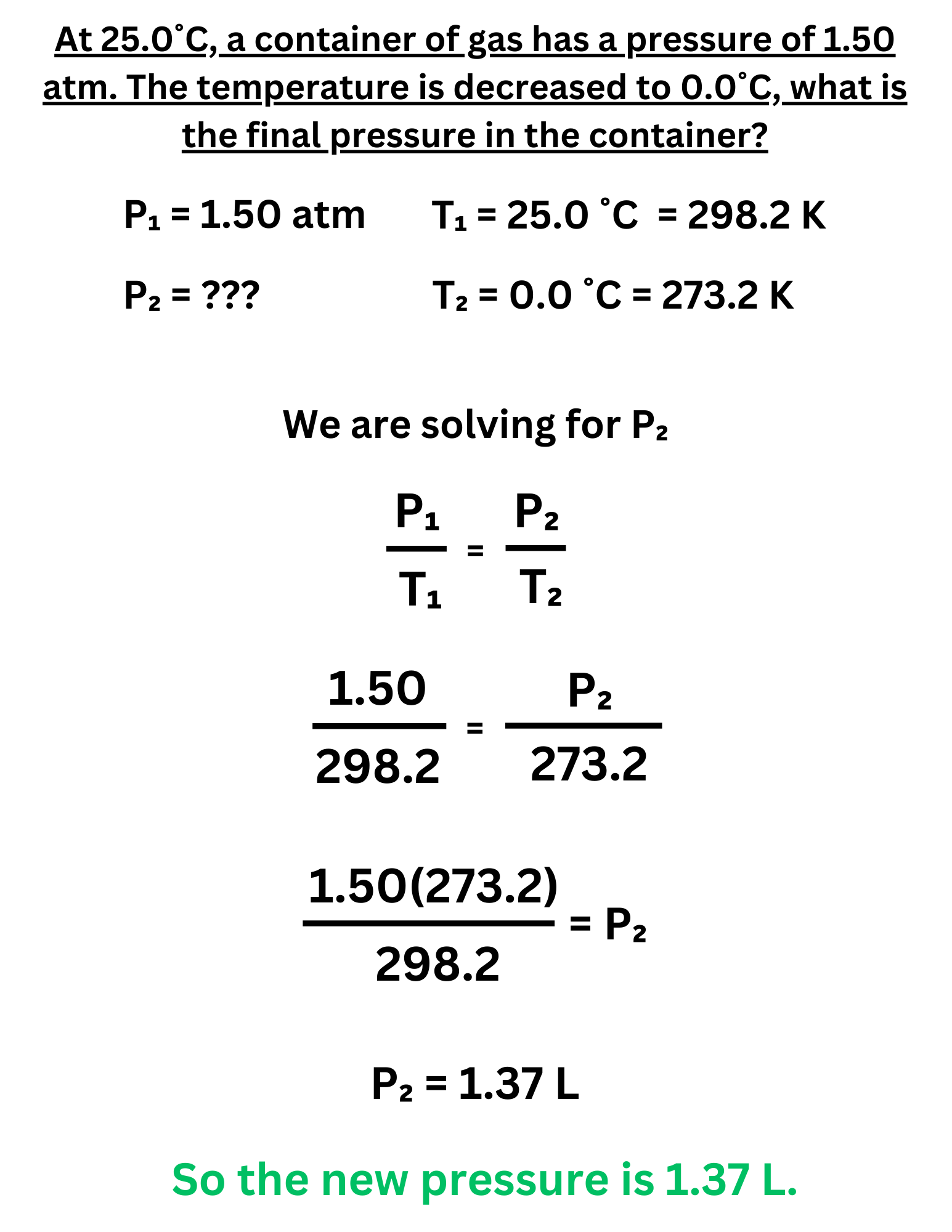 At 25.0˚C, a container of gas has a pressure of 1.50 atm. The temperature is decreased to 0.0˚C, what is the final pressure in the container?