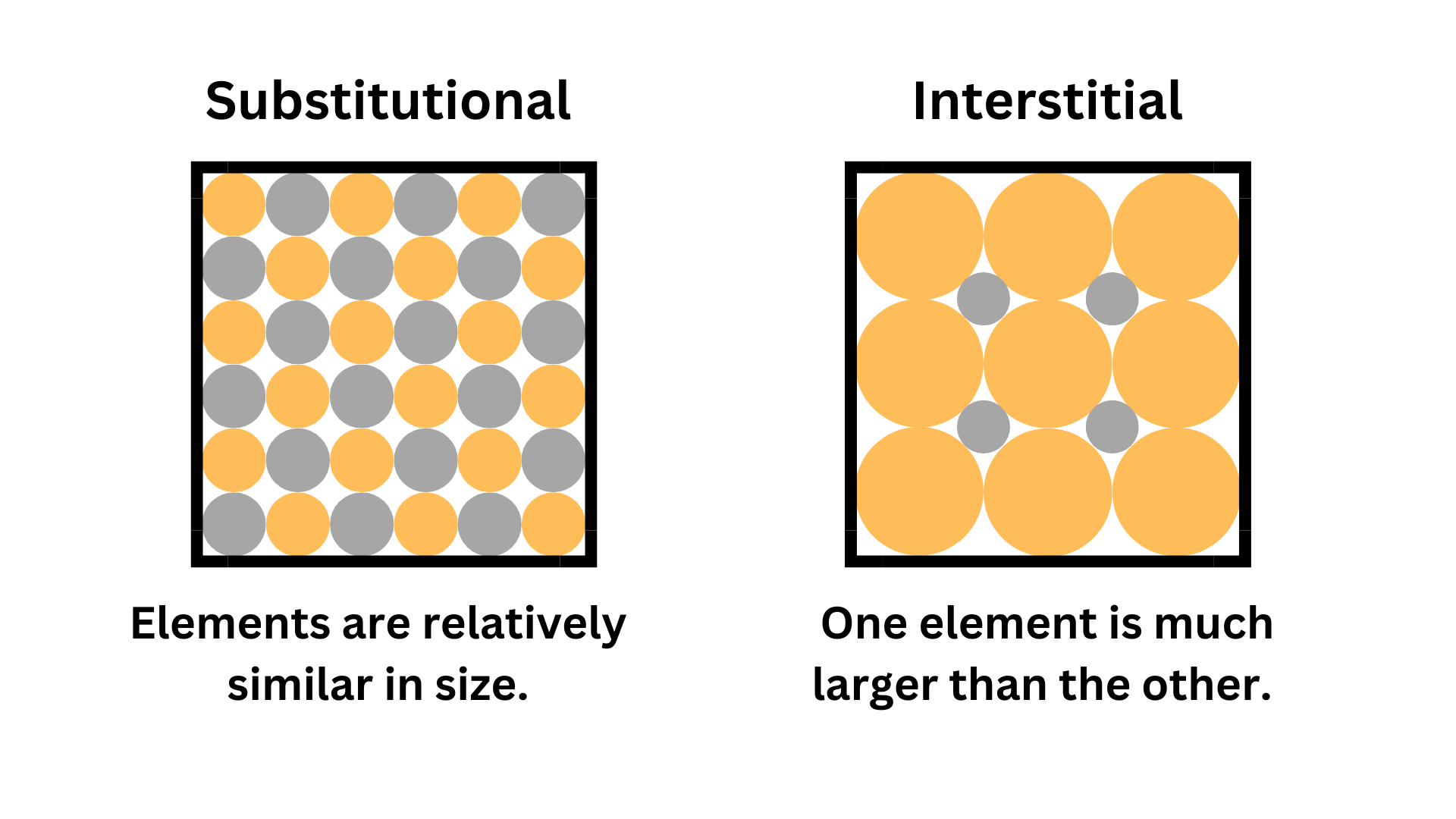 Substitutional: Atoms in the alloy are around the same size.