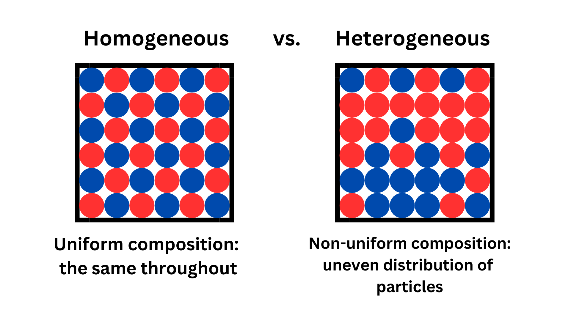 A heterogeneous mixture does not have uniform composition. It is not the same throughout. For example, a salad may have more tomatoes on one side than the other. Or, your cookie may have more chocolate chips in certain areas.
