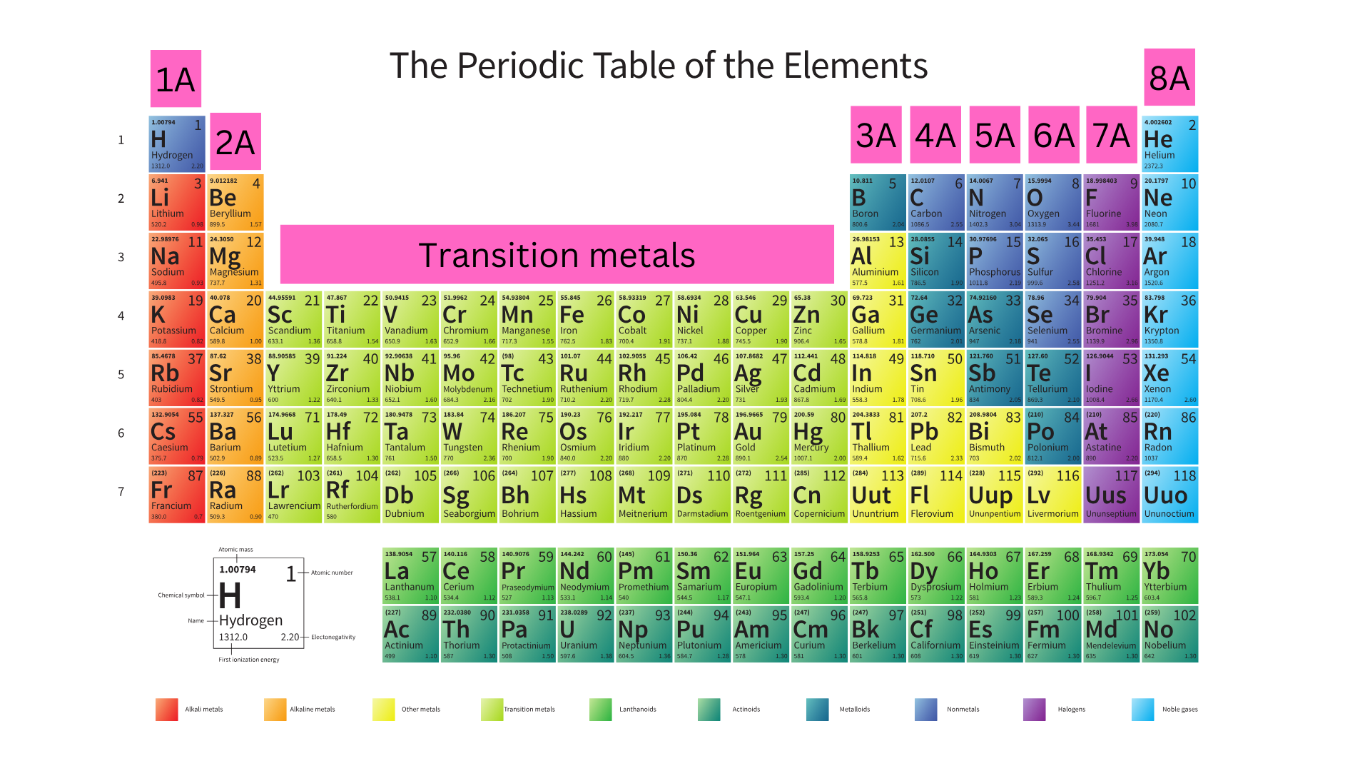 You have seen groups on the periodic table labeled 1-18, but there is another way of writing them. Sometimes you will see group numbers with an “A”, (ex. Group 1A, Group 2A). This classification goes from 1A – 8A and excludes the transition metals, as shown in the image below ↴