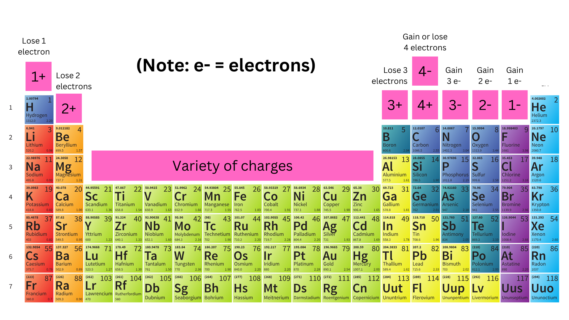 Transition metals are a little weird. They don’t necessarily need 8 valence electrons (you will learn more about this in later units). They have extra spaces for valence electrons, so they can exhibit a range of charges. For example, iron can be Fe²⁺ or Fe³⁺.