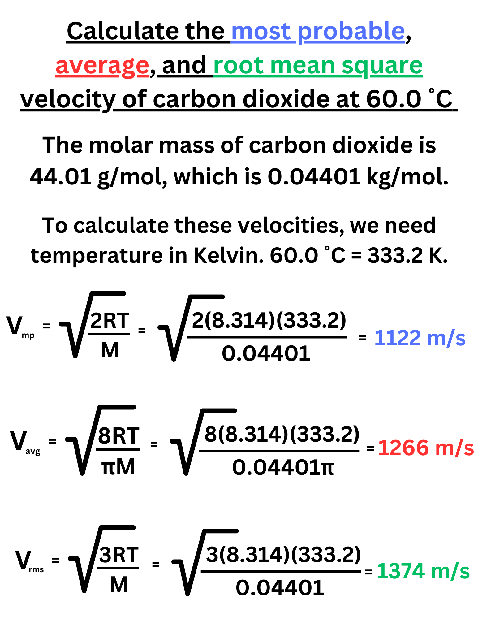 Calculate the most probable, average, and root mean square velocity of carbon dioxide at 60.0 ˚C
