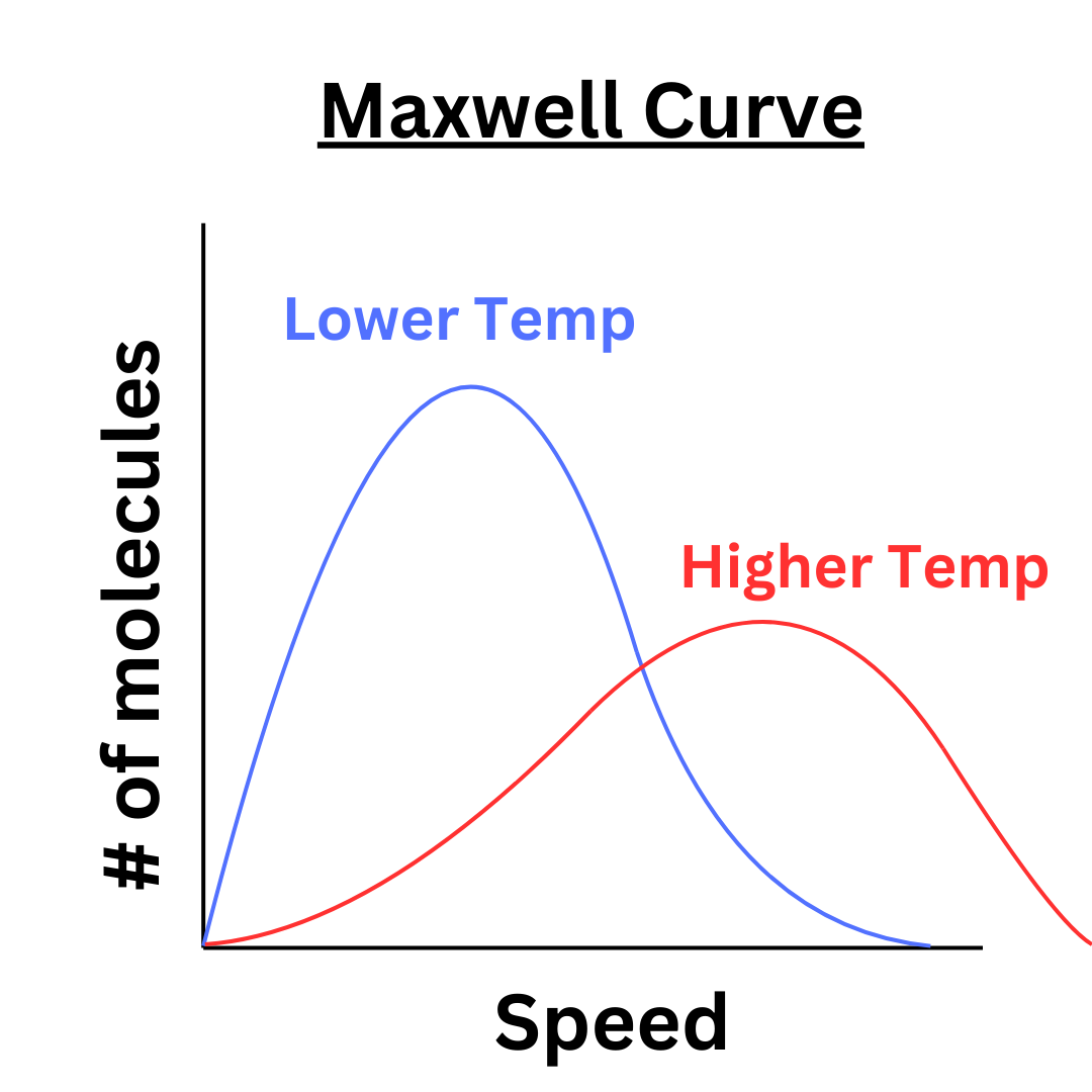 How does the Maxwell Curve change as the temperature changes? As temperature increases, the kinetic energy of the gas particles increases. Therefore, the velocities of the particles increase. This creates the following effect ↴