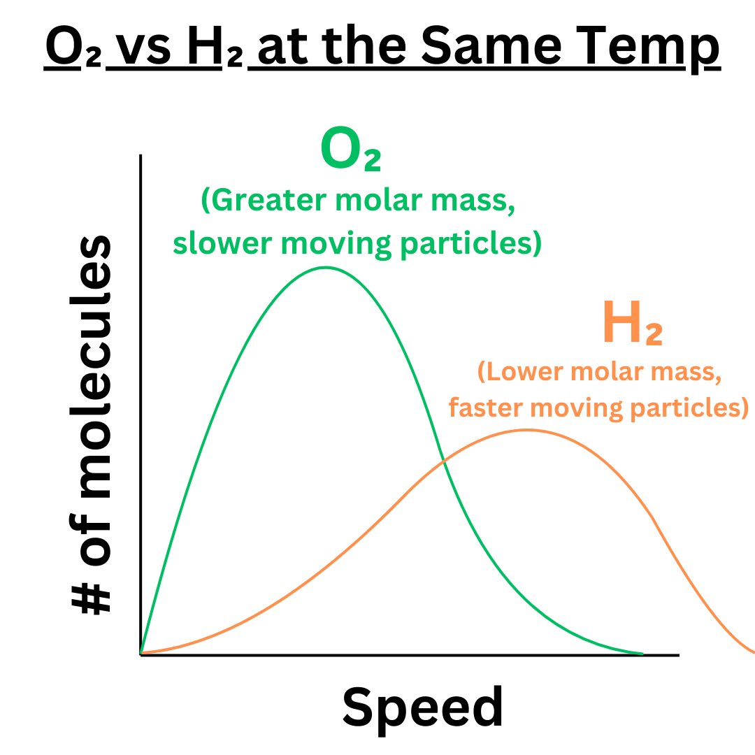 Now that we’ve compared different temperatures, let’s compare different gasses at the same temperature. When two gasses are at the same temperature, they have the same average kinetic energy. KE = ½ mv², so the gas with the greater mass will have slower molecules. The lighter gas will have faster particles.