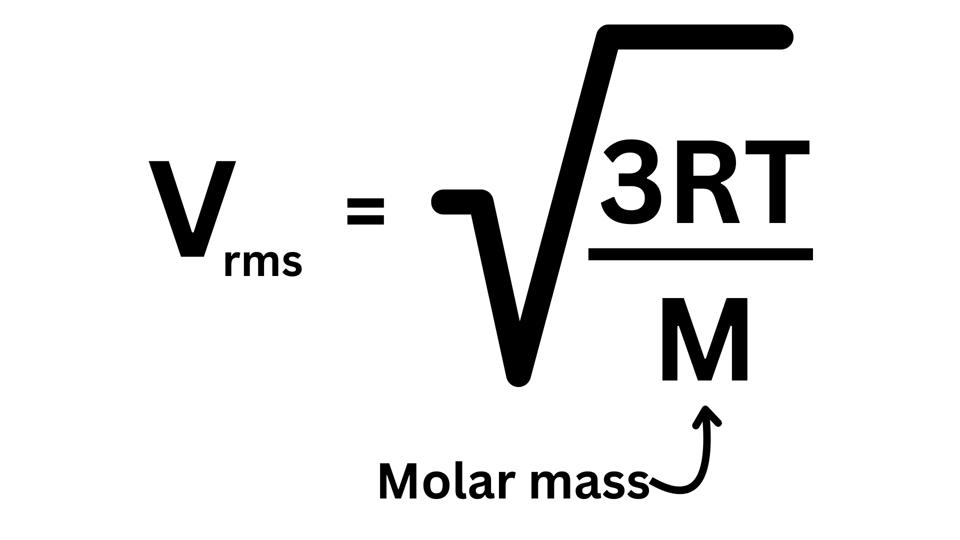 Root Mean Square Velocity: The velocity of a gas molecule that has average kinetic energy. If you were to measure the kinetic energy of each particle in a gas, and then find the average KE, a molecule with that average KE possesses the root mean square velocity. This may seem similar to average velocity. For the average velocity, we simply are finding the mean velocity. For the root mean square velocity, we are finding the mean KE, and then looking at the velocity of a particle with the mean KE. In the kinetic energy equation, KE = ½ mv², velocity is squared, which is why the root mean square velocity does not equal the average velocity. In fact, the root mean square velocity will always be slightly greater. Here is how you find the root mean square velocity ↴
